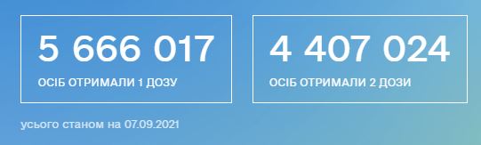 По состоянию на 7 сентября в Украине вакцинировано 5 666 019 человек. Из них 4 407 024 - прошли полный курс двумя дозами.