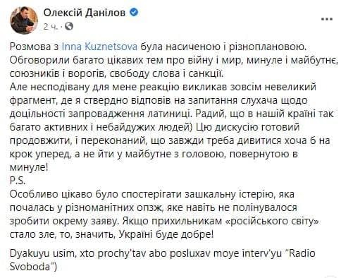"Неожиданную для меня реакцию вызвал совсем небольшой фрагмент, где я утвердительно ответил на вопрос слушателя, который касался целесообразности внедрения латиницы. Рад, что в нашей стране так много активных и небезразличных людей", написал Данилов.