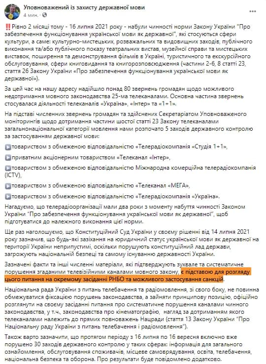 Языковой омбудсмен Тарас Креминь предлагает ввести санкции СНБО против крупнейших украинских телеканалов, потому что они, по его словам, нарушают языковой закон.
