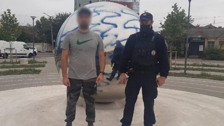 В городе Белая Церковь мужчина разрисовал памятник Героям борьбы за независимость Украины. Фото: Пресс-служба Нацполиции