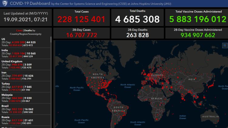 По данным на утро 19 сентября число зараженных на Земле перевалило за 228 миллионов, фото arcgis.com