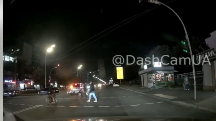 На видео зафиксировано, что мужчина в электроколяске для людей с инвалидностью движется со скоростью приблизительно 15 км/час, подрезает легковой автомобиль и проезжает на красный свет. Это произошло на перекрестке между Харьковским шоссе и Брацлавской улицей.