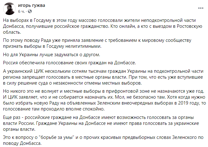 Это к вопросу о "борьбе за умы" и о прочих красивых предвыборных словах Зеленского по поводу Донбасса", - пишет в Facebook главный редактор "Страны" Игорь Гужва.