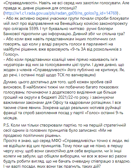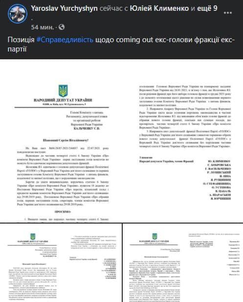 Как сообщил нардеп от фракции "Голос" Ярослав Юрчишин на своей странице в Facebook, после заявлений Железняка  депутаты из "Справедливости" направили письмо на имя главы регламентного комитета Сергея Кальченко и спикера Верховной Рады Дмитрия Разумкова.