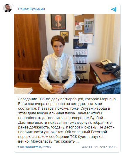 "Слугам народа в этом деле нужна длинная пауза. Зачем? Чтобы попробовать договориться с генералом Бурбой. Даст нужные власти показания - ему вернут отобранные ранее должность, госдачу, паспорт и охрану. Не даст - неприятности умножатся. Объявленный Безуглой перерыв в таком сообщении ТСК будет тянуться вечно. Моновласть, так сказать ...", - написал Кузьмин в соцсети.