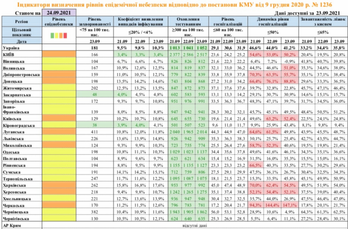 На сайте Минздрава опубликован список регионов, которые близки к переходу в красную зону - в МОЗ их маркируют как "оранжевые". Это и Киев и указанные области: