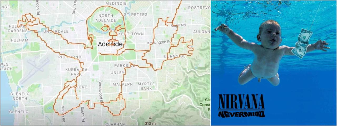 В Австралии велосипедист Питер Стоукс в честь 30-летия альбома Nevermind группы Nirvana решил воссоздать его обложку с помощью веломаршрута, который фиксировал на GPS.