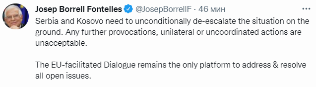 Верховный представитель ЕС Жозеп Боррель заявил, что стороны конфликта Северного Косова - Белград и Приштина - должны немедленно разрядить обстановку в регионе, вывести оттуда силы спецназначения и ликвидировать блокпосты.