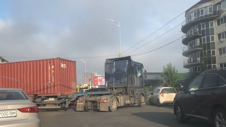 Инцидент произошел около семи утра на Днепровской набережной в Дарницком районе столицы, недалеко от торгово-развлекательного центра River Mall. Водитель фуры пытался развернуться, но застрял посередине дороги и заблокировал три полосы движения, что привело к образованию пробки.