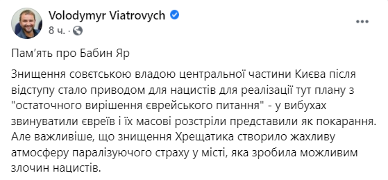 "Уничтожение советской властью центральной части Киева после отступления стало поводом для нацистов для реализации здесь плана по "окончательному решению еврейского вопроса" - во взрывах обвинили евреев, и их массовые расстрелы представили как наказание. Но важнее, что уничтожение Крещатика создало ужасную атмосферу парализующего страха в городе, которая сделала возможным преступление нацистов", - пишет Вятрович.