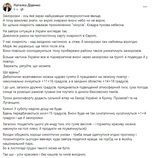 Синоптик объяснила, как и где облачность спасет украинцев от ночных заморозков в начале октября