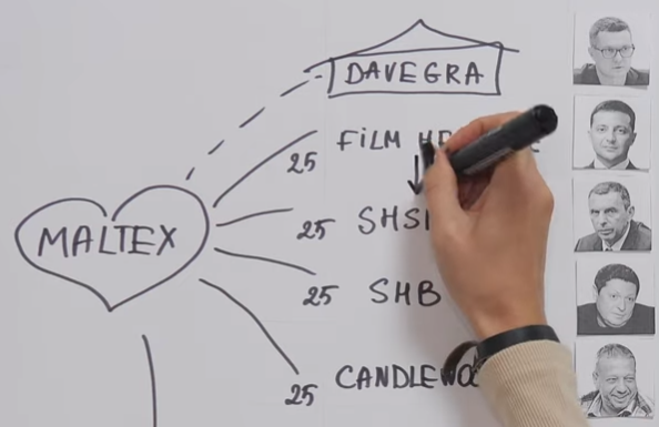 13 марта 2019 года, в разгар президентских перегонов, адвокат Юрий Азаров, который работает на фирмы Зеленского и его партнеров, подписывает документ о передаче акций компании "Малтекс", которая поровну разделена между офшорами руководителей "95 Квартала". Фирма Сергея Шефира безоплатно получила 1/4 собственности Малтекс от белизской компании Зеленского.