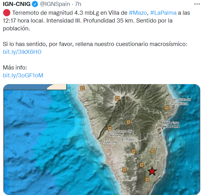 Национальный Географический Институт сообщил о землетрясении на Ла-Пальме. Источник: Twitter/НГИ