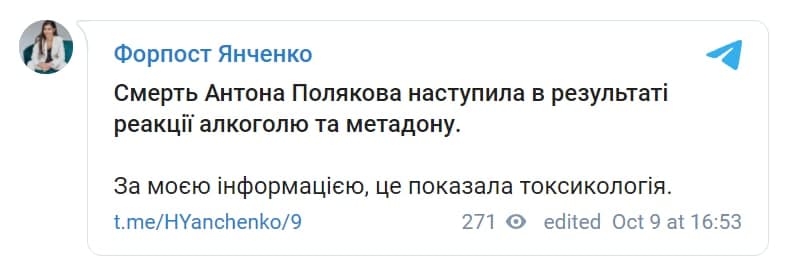 Народный депутат Янченко проинформировала, что смерть Антона Полякова наступила в результате реакции алкоголя и метадона. По ее информации, это показала токсикология.
