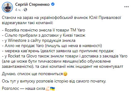 "Есть первая небольшая победа! Еще вчера Rozetka продавала 56 наименований Yaro, и в наличии они были почти все, и сегодня в течение дня большинство товаров были удалены, а на всех 20, которые еще показывает в поиске, стоит пометка "отсутствует в продаже"... А вот Сильпо, Glovo, Алло и ряд других компаний пока молчат. Надеюсь, от них также будет реакция" - написал Стерненко и призвал оставлять на их страницах комментарии и спрашивать "о сотрудничестве с украинофобкой Юлией Приваловой".