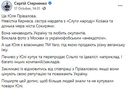 "Это Юля Привалова. Невестка Кернеса, сестра нардепа из "Слуги народа" Козака и дочь мэра города Сокиряны. Она ненавидит Украину и любит оккупантов. Выложила фото из Москвы с украинофобским "анекдотом" - написал Стерненко и призвал сеть супермаркетов "Сильпо" и кофейни "Идеалист" отказаться от сотрудничества с Приваловой, "если они дорожат своей репутацией и уважают Украину".