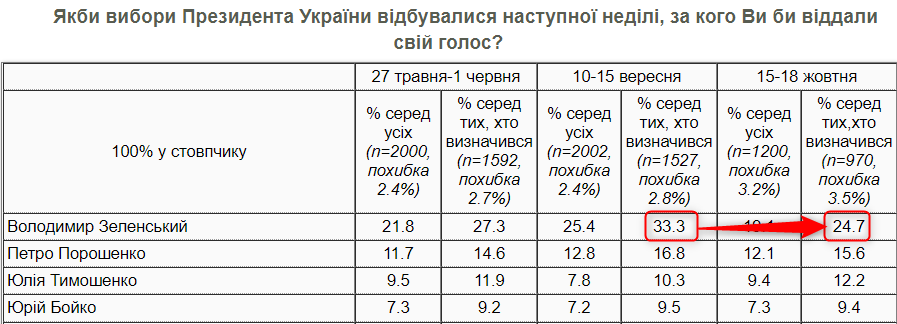 Если в сентябре за него бы проголосовали 33,3% опрошенных, то в октябре - 24,7%. Причем этот показатель даже ниже уровня июня, когда у президента было 27,3%.
