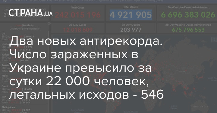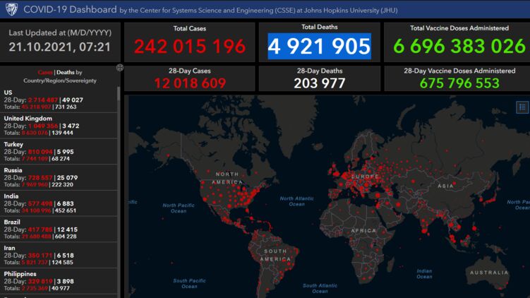 Университет Джона Хопкинса также привел новые данные на утро 21 октября. С начала пандемии на планете уже 242 015 196 человек заразились СOVID-19. Умерли за этот же срок - 4 921 905 человек.