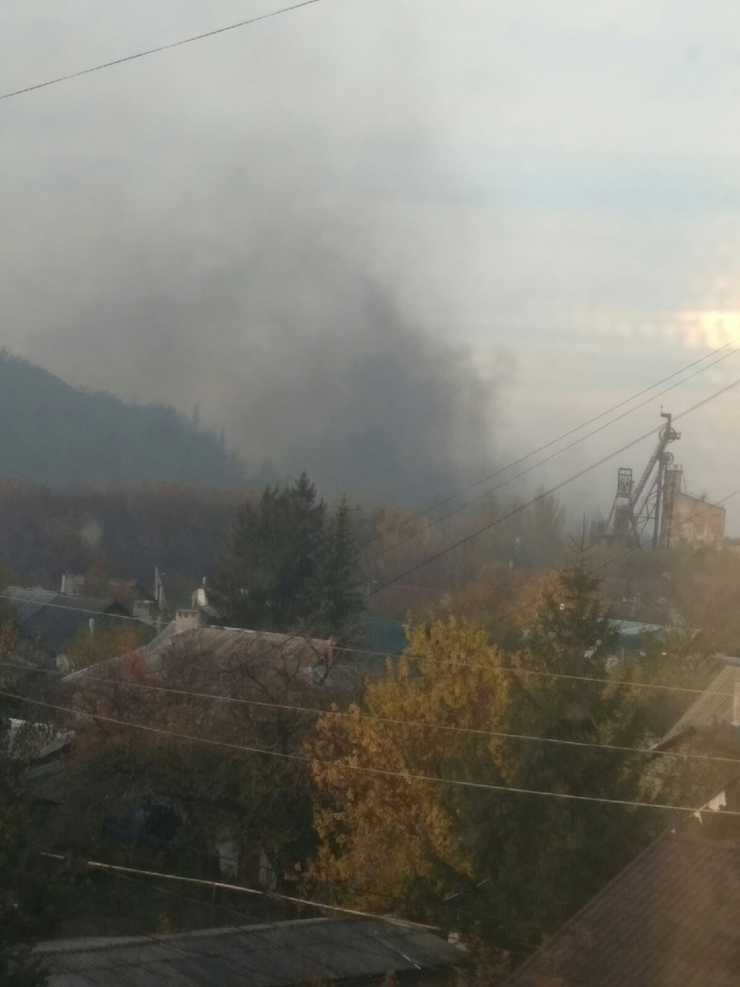 Также местные жители публикуют в соцсетях такие фото после обстрела. На снимке видны частный сектор, оборудование шахты и густой черный дым.