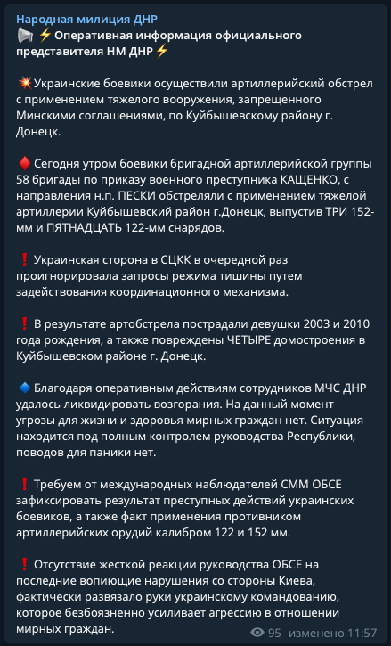 "В результате артобстрела пострадали девушки 2003 и 2010 года рождения, а также повреждены четыре домостроения по адресам: ул. Дружбы д.16,18,18А и Славина д.1А", - сообщает "Народная милиция "ДНР".