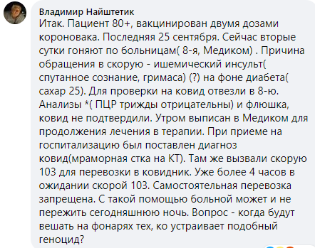 Журналист Станислав Речинский описывает случай: ночью вызывали скорую, но ковидных мест городе нет.