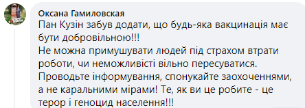 Антипрививочных настроений в целом очень много. Множество таких отзывов можно встретить в комментариях на странице главного санитарного врача Игоря Кузина, который призывает людей делать прививки.