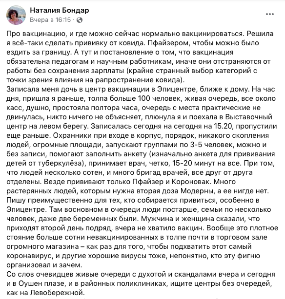 "Записала меня дочь в центр вакцинации в Эпицентре, ближе к дому. На час дня, пришла я раньше, толпа больше 100 человек, живая очередь, все около касс, душно, простояла полтора часа, очередь с места практические не двинулась, никто ничего не объясняет, плюнула я и поехала в Выставочный центр на левом берегу. Записалась сегодня на сегодня на 15.20, пропустили еще раньше.