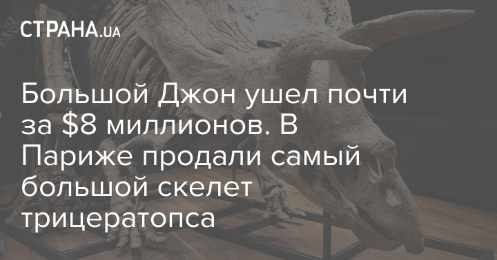На аукционе в Париже 21 октября ушли с молотка окаменелые останки трицератопса Большого Джона - самого большого из когда-либо найденных растительных динозавров этого вида. Окаменелости были проданы по цене 6,65 миллиона евро (или 7,74 миллиона долларов).