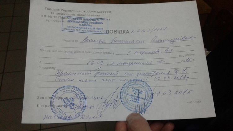 Гражданка РФ Анастасия Леонова, которую обвиняют в Украине в терроризме, не придет сегодня на суд из-за плохого самочувствия. Об этом из зала суда сообщает корреспондент Страны. Подозреваемая в телефонном режиме сообщила адвокату, что очень плохо себя чувствует и останется в больнице до воскресенья. В справке о болезни Анастасии Леоновой сказано, что у девушки острый бронхит. Судебное заседание по делу Леоновой состоится сегодня в 11:30, однако, его могут перенести из-за неявки Леоновой.