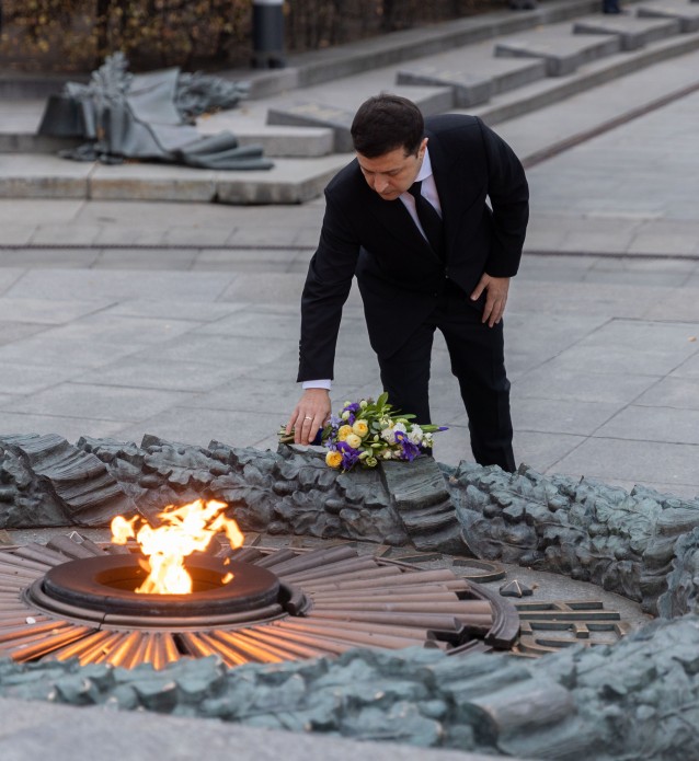 Аккуратный букет у Вечного огня первым оставил президент Владимир Зеленский. В своем поздравлении он назвал годы оккупации черным периодом в истории, а погибших во Второй мировой войне героев - примером для украинских военных на Донбассе.