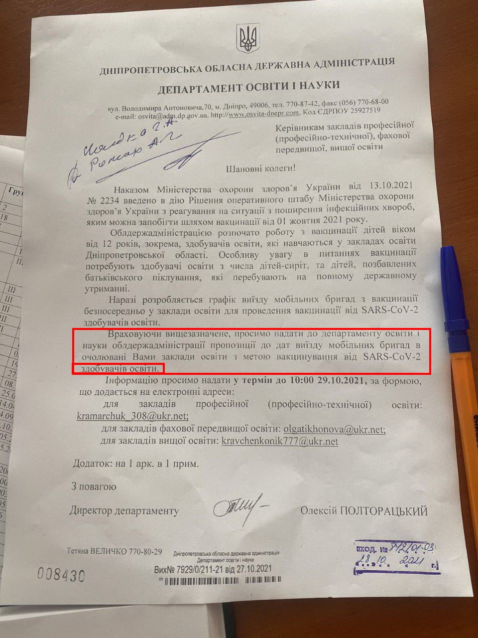В Днепропетровской области 28 октября руководителей профтехучилищ, колледжей и вузов уведомили о том, что собираются запустить массовую вакцинацию от ковида детей от 12 лет с выездом медбригад в учебные заведения. Об этом говорится письме Департамента образования и науки. Судя из текста, в первую очередь планируют привить детей-сирот и детей, лишенных родительской опеки, которые находятся на полном государственном обеспечении.