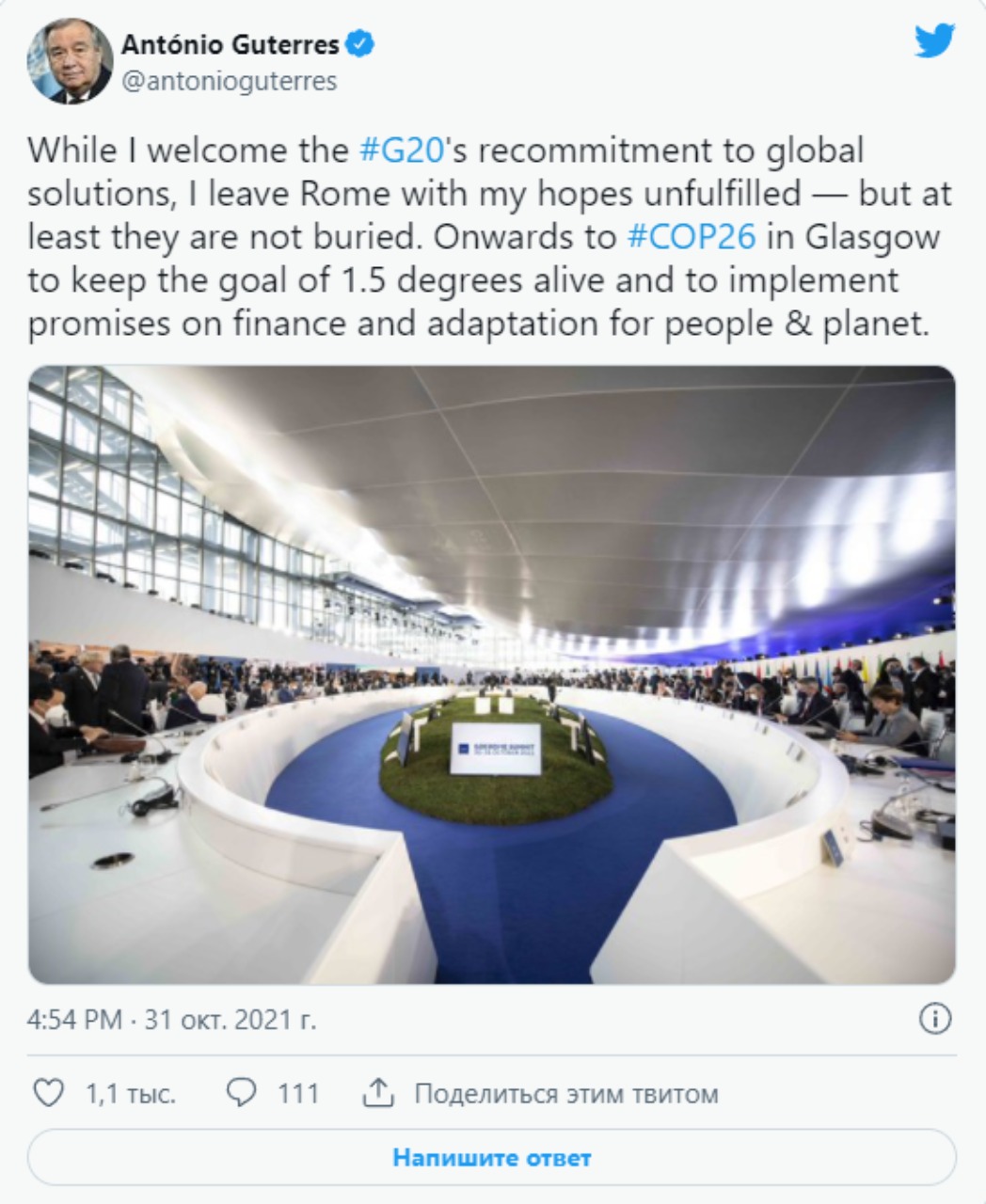 "Несмотря на то, что я приветствую подтверждение приверженности "Большой двадцатки" глобальным решениям, я покидаю Рим с несбывшимися надеждами — но, по крайней мере, они не похоронены", — заявил Гутерриш.