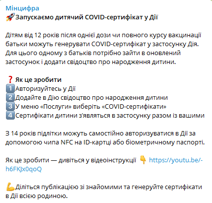 Министерство цифровой трансформации запускает в приложении "Дия" детский COVID-сертификат, который имеют право получить подростки старше 12 лет.