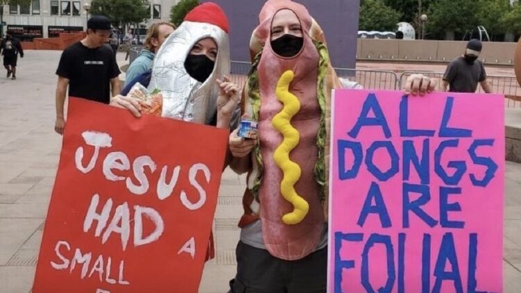 В частности, на митинг пришли двое мужчин, одетые как хот-доги. Они держали таблички с надписью "все пенисы равны", "Хватит шеймить маленькие пенисы". Другой, одетый в костюм пениса, размахивал плакатом, гласящим, что "все пенисы попадают в рай".