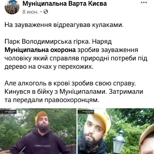 На странице организации в Facebook от 8 июня сохранился пост, в котором говорится, что якобы пьяный мужчина отреагировал кулаками на замечание наряда, поэтому был задержан и передан правоохранителям.