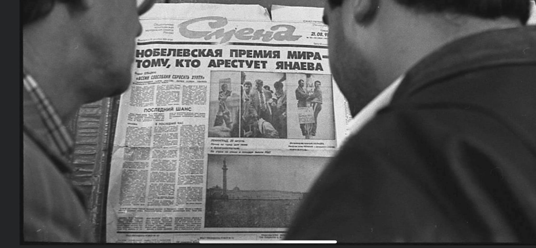 А фотографией обложки на странице своего Фейсбука выбрал архивное фото передовицы за 21 августа 1991 года советской газеты "Смена" с заголовком "Нобелевская премия мира - тому, кто арестует Янаева" (главу ГКЧП, - Ред.).