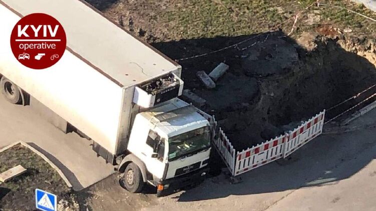 В Киеве грузовик угодил в яму, разрытую накануне коммунальными службами