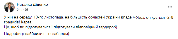 "Температура воздуха завтра днем ​​лишь +4+6 градусов, в ночь на 10 ноября возможно до 6 градусов мороза. Утепляйтесь, резину переобувайте, поддерживайте себя и друг друга чем-то хорошим", - рекомендует Диденко.