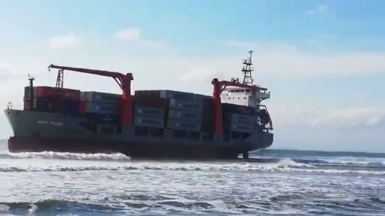 В Японском море на мель сел контейнеровоз. Из-за непогоды спасатели не могут эвакуировать экипаж. Видео
