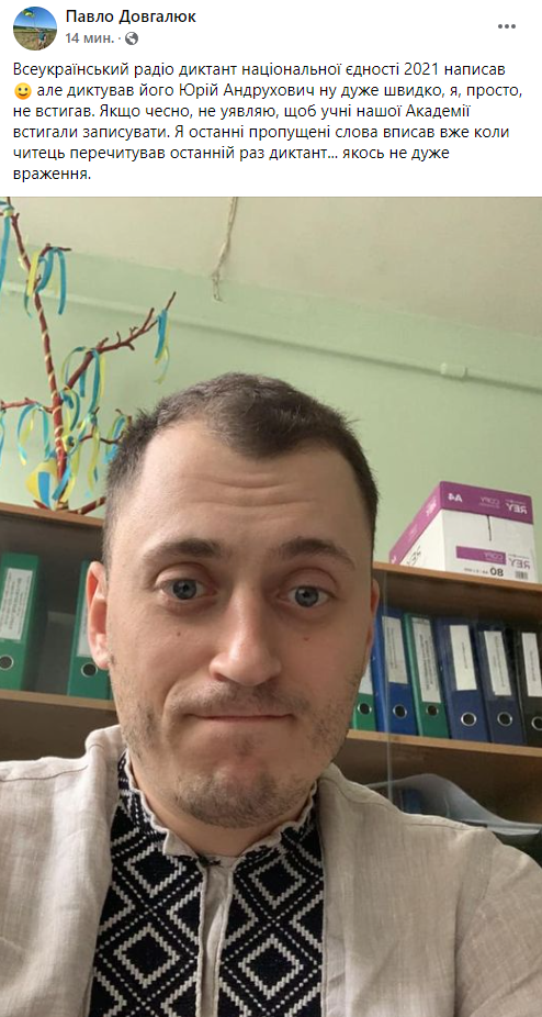 Интересно, что президент Зеленский отказался участвовать в радиодиктанте национального единства, сославшись на другие планы. Зато участвовал глава Нацпамяти Антон Дробович, который впервые со времен школы сел за написание диктанта.