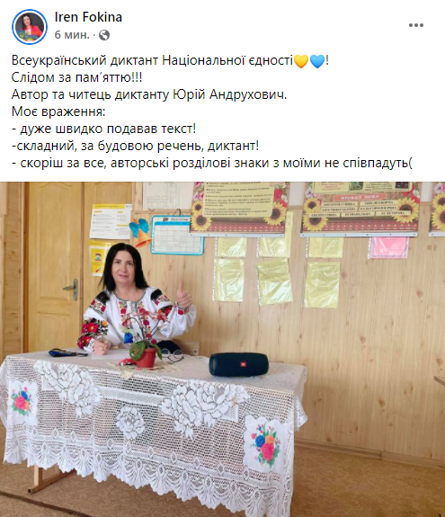 "Писала диктант национального единства. Интересный текст. Послезавтра проверю, как написала. Временами слишком быстро Юрий Андрухович диктовал", - поделилась впечатлениями Парасковия Нечаева.