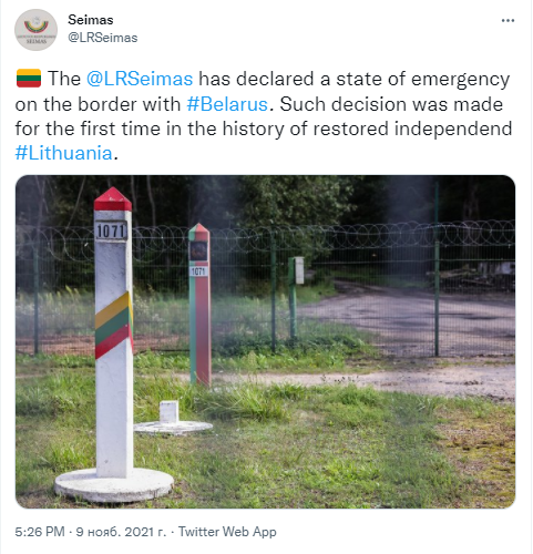 "Сейм Литвы объявил режим ЧП на границе с Белоруссией. Такое решение было принято впервые в истории восстановленной независимой Литвы", - говорится в сообщении.