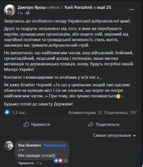 "Друзья и подруги, призываю вас держать добровольческий строй. Не исключено, что в ближайшее время ваш военный, боевой, организационный, человеческий опыт и потенциал, ваша высокая мотивация и государственная позиция, опять, будут нужны нашей Матери-Украине! Контакты с командирами и штабами у всех вас есть…", - написал Ярош.