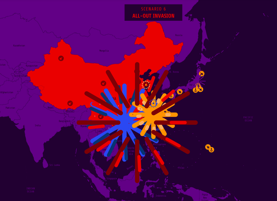 Без предупреждения НОАК осуществляют массированные воздушные, ракетные и кибератаки по ключевым военным и гражданским целям по всему Тайваню. В то же время НОАК атакует базы США в Японии и Гуаме с помощью воздушных и ракетных ударов, пытаясь парализовать американские силы и отсрочить любое вмешательство.