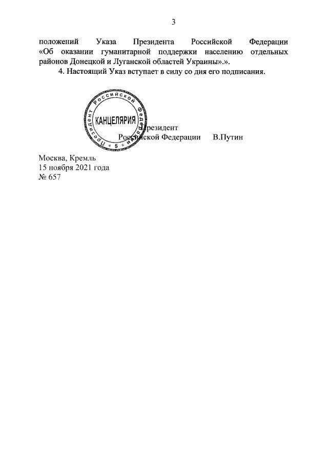 Президент России Владимир Путин подписал указ, в соответствии с которым жители непризнанных "Донецкой" и "Луганской народных республик" получат гуманитарную поддержку. В документе, опубликованном на официальном портале правовой информации, речь идет об "отдельных районах Донецкой и Луганской областей Украины".