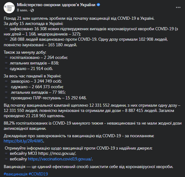 За прошлые сутки, 15 ноября, в Украине коронавирус обнаружили у 16 308 человек. Среди новых заболевших 1 168 детей и 327 медиков. В больницы попали 2 264 пациента с ковидом. 838 человек умерли, 21 914 - выздоровели.