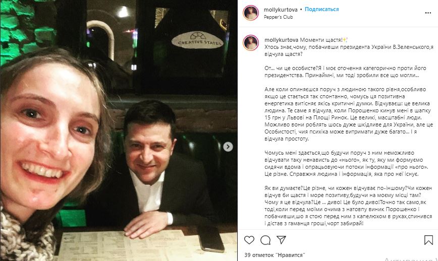 "Кто-то знает почему, увидев президента Украины Зеленского, я ощутила счастье? Чувствуешь: это великий человек. То же я почувствовала, когда Порошенко бросил мне в шапку 15 грн во Львове на Площади Рынок. Это великие, масштабные люди. Возможно, они делают что-то очень вредное для Украины, но это Личности, чья психика может выдержать очень много... Я была в шоке, когда я увидела, как в 0,5 м от меня идет Зеленский с компанией. Я повисла и не могла поверить своим глазам, они сели за нами", - написала певица Молли Куртова.