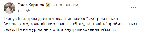 "Посмотрел на Инстаграм девушки, которая "случайно" встретила в пабе Зеленского, когда он болел за сборную, и "даже" сделала с ним селфи. Это уже урина не в глаза, а внутривенная инъекция" - написал Олег Карпюк.