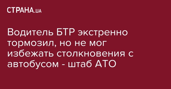 "Доезжая до перекрестка, несмотря на размещенный знак "проезд без остановки запрещен", водитель БТР-80 продолжил движение. В это время по главной дороге двигался пассажирский автобус, в котором находилось 10 человек. Механик применил экстренное торможение, однако не смотря на незначительное расстояние, не сумел избежать столкновения и совершил наезд на переднюю часть автобуса", - рассказал заместитель прокурора сил АТО Виталий Панченков эфире телеканал ""112 Украина".