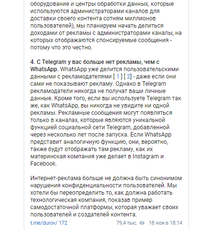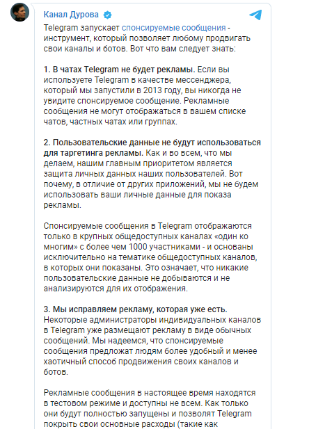 "Интернет-реклама больше не должна быть синонимом нарушения конфиденциальности пользователей. Мы хотели бы переопределить то, как должна работать технологическая компания, показав пример самодостаточной платформы, которая уважает своих пользователей и создателей контента", - написал Дуров.